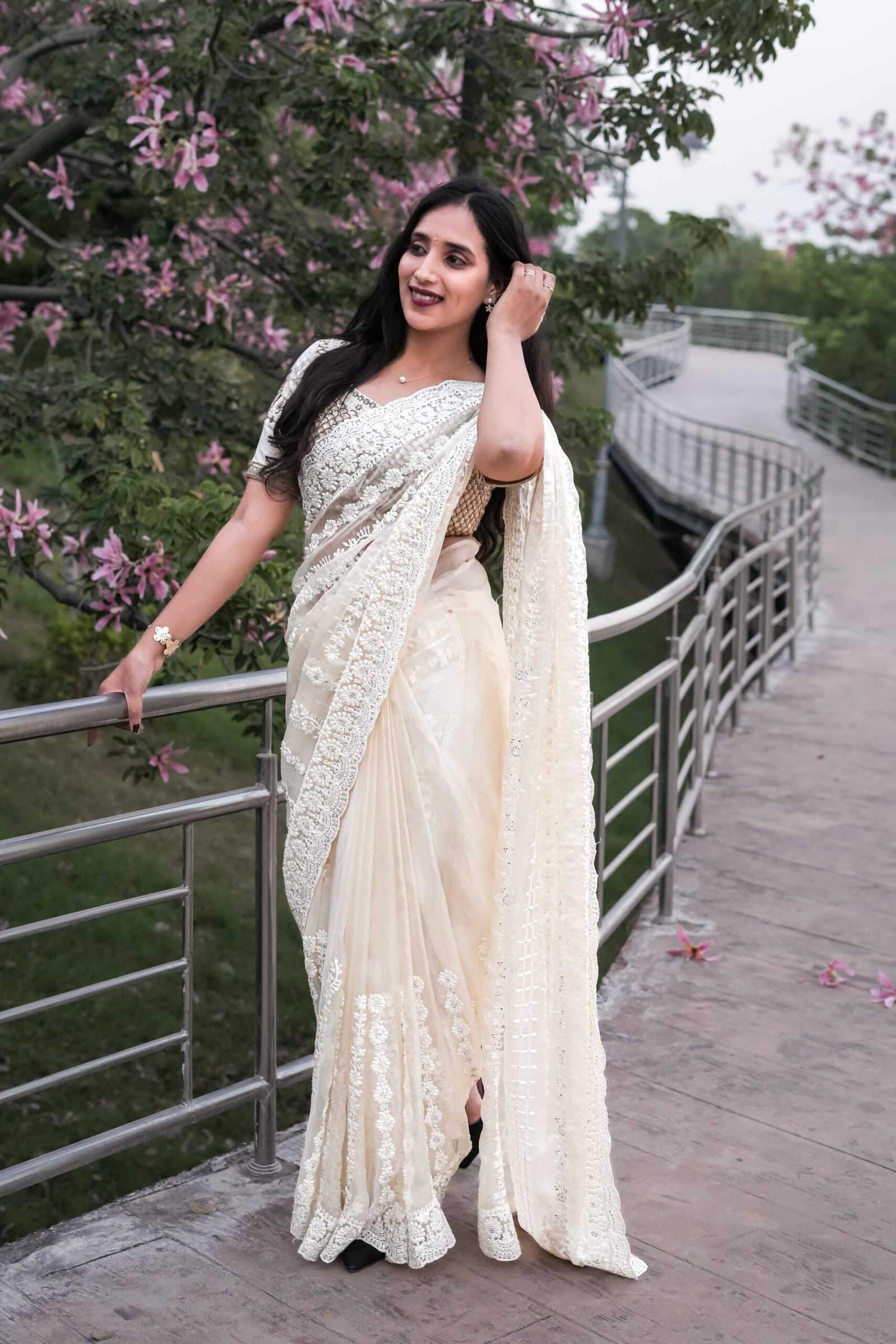 Ivory Glamorous Net Saree with Pearl Embellishments
