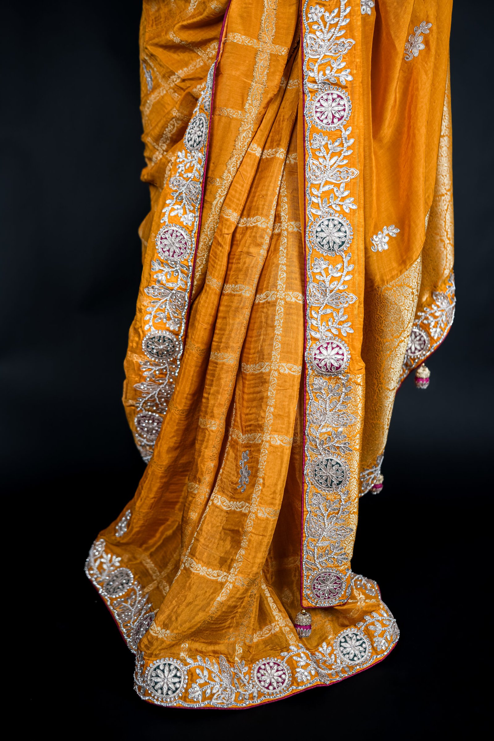 What makes this saree truly extraordinary is the intricate mirror work scattered throughout the body—tiny reflective embellishments that catch and reflect light with every movement, creating a mesmerizing sparkle that draws admiring glances.