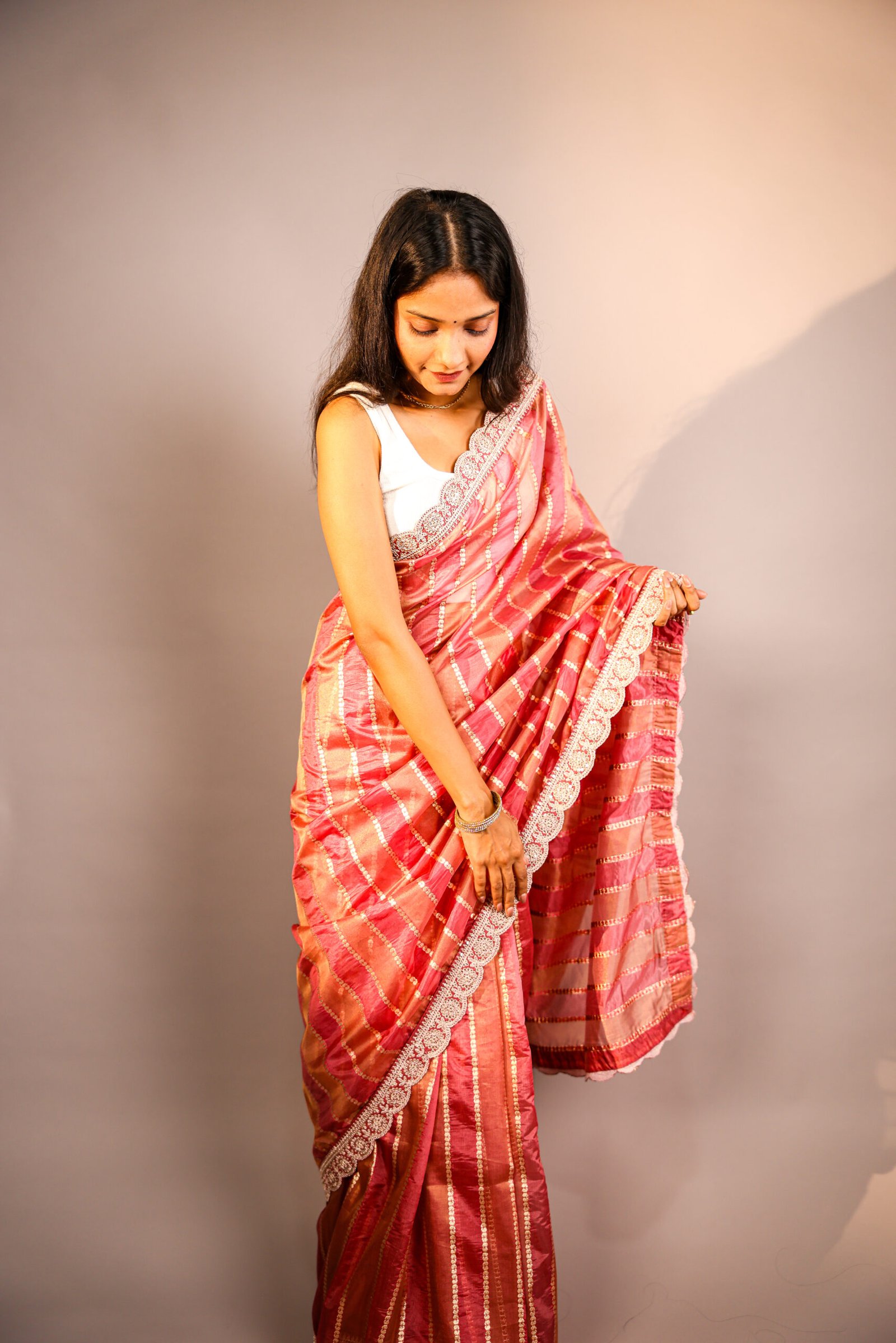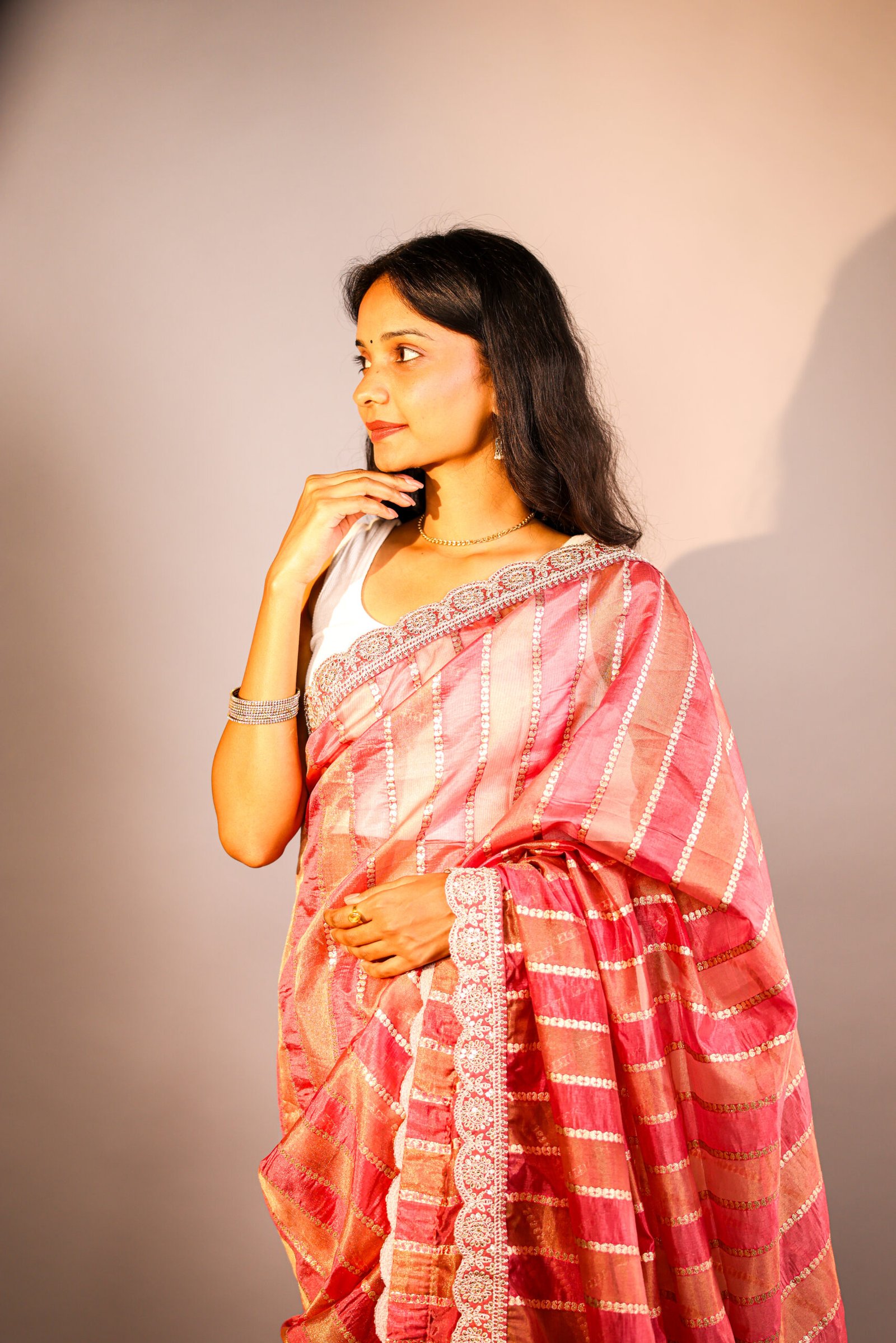 Stunning Rose-Gold Designer Saree – Luxury Banarasi Stripes